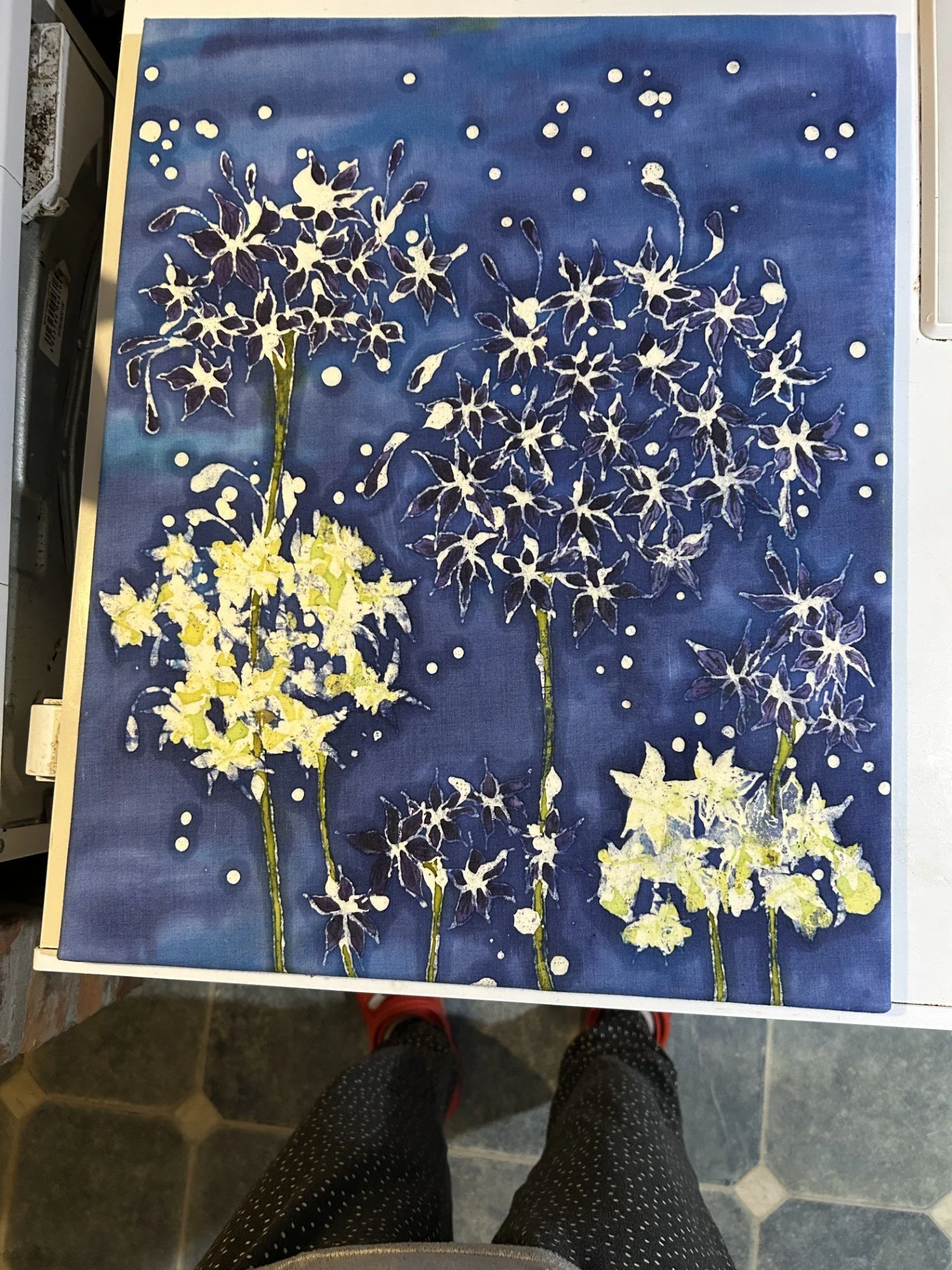Once your batik has been completed and dried you shall take your cloth off the frame and iron off all of the wax. It shall then be stapled to a plain canvas that you can take home and place on a wall immediately.